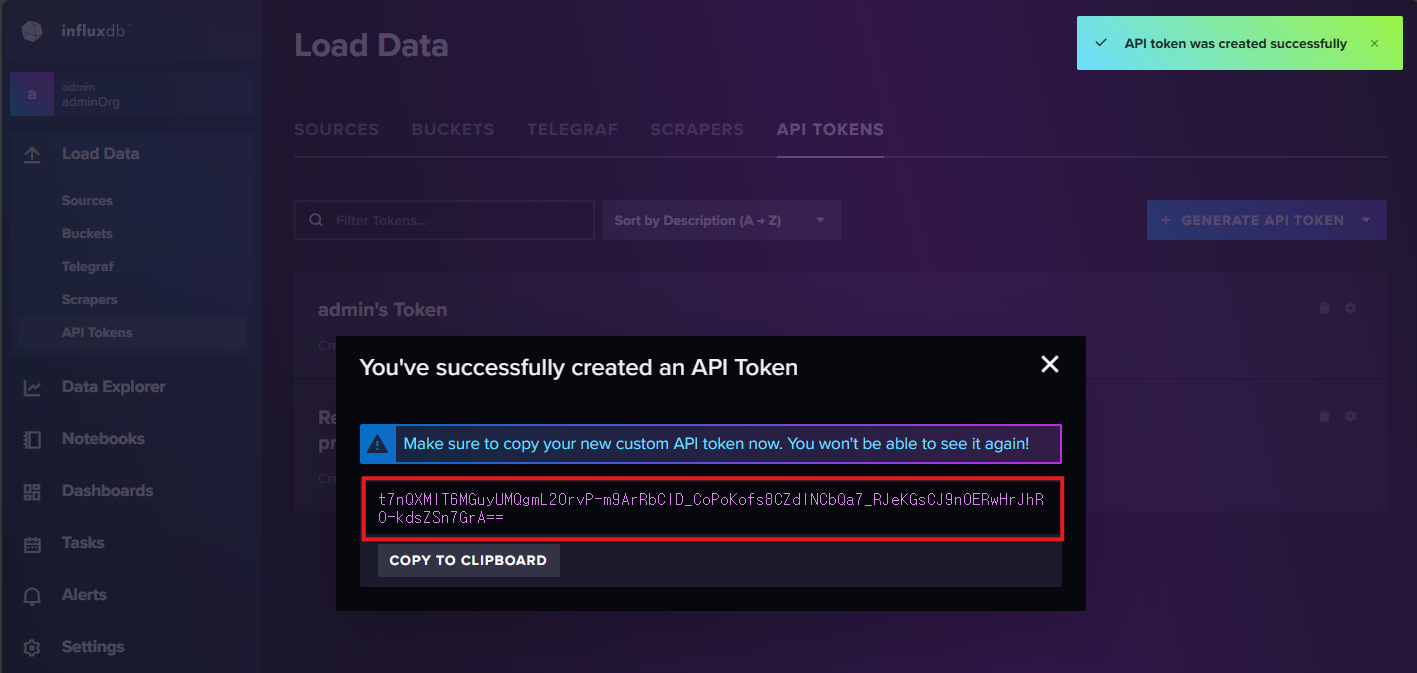 Influx WEB > Load Data > API Tokens > GENERATE API TOKEN